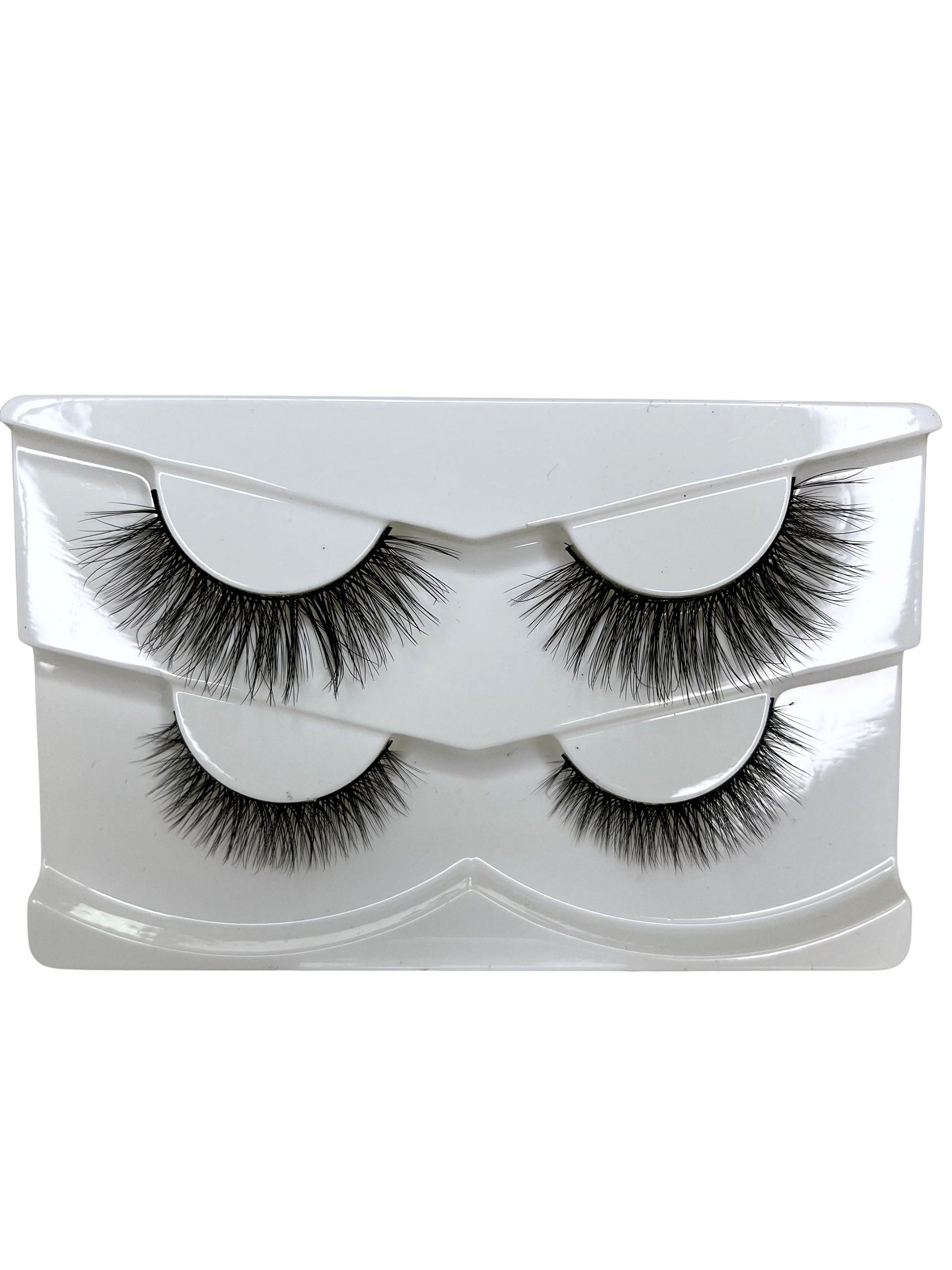 São 2 pares de cílios: um leve para o dia e outro mais volumoso para a noite. Naturais, macios, reutilizáveis e feitos para durar.